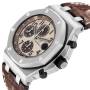 Replica Audemars Piguet Royal Oak Offshore Safari Steel Mens Watch 26470ST. Automatic self-winding chronograph movement. Stainless steel octagonal case 42.0 mm in diameter. Transparent exhibition sapphire crystal caseback. Two pushers operate the chronograph function. Audemars Piguet logo on the black ceramic-outlined crown. Stainless steel bezel punctuated with 8 signature screws. Scratch resistant glareproof sapphire crystal with interior cyclops magnifer. Ivory dial with "Mega Tapisserie", waffle pattern with applied steel rimmed Arabic numeral hour markers with brown luminescent fill. Steel-outlined brown luminescent-filled royal oak baton hands. Date calendar window at the 3 o'clock aperture. Tachymeter scale around the black inner bezel. Three brown chronograph subdials - running small seconds, 30 minutes and 12 hour registers. Brown "Hornback" crocodile strap outlined in white stitching with a stainless steel tang buckle.