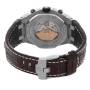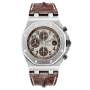 Dial: Ivory dial with "Mega Tapisserie", waffle pattern with applied steel rimmed Arabic numeral hour markers with brown luminescent fill. Steel-outlined brown luminescent-filled royal oak baton hands. Date calendar window at the 3 o'clock aperture. Tachymeter scale around the black inner bezel. Three brown chronograph subdials - running small seconds, 30 minutes and 12 hour registers.