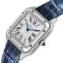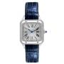 Cartier Santos Dumont Small Steel Ladies Watch. Quartz movement. Stainless steel case 38.0 mm x 27.5 mm. Circular grained crown set with blue spinel cabochon. Stainless steel bezel punctuated with 8 signature screws. Scratch resistant sapphire crystal. Satin-brushed silver dial with sunray effect with black Roman numeral hour markers and an outer minute track. Sword-shaped blue hands. Secret Cartier signature at VII. Blue leather strap with a stainless steel tang buckle.