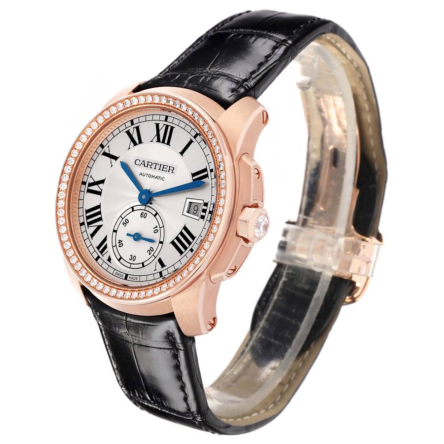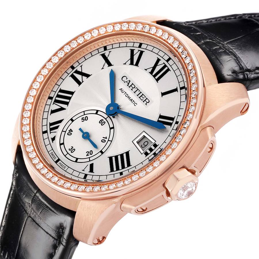 Replica Cartier Calibre 38 Silver Dial Rose Gold Diamond Mens Watch WF100013. Automatic self-winding movement. 18k rose gold round case 38.0 mm in diameter. Crown set with a faceted replica Cartier factory diamond. Transparent exhibition sapphire crystal case back. 18k rose gold replica Cartier factory diamond bezel. Scratch resistant sapphire crystal. Silver guilloche dial with black Roman numeral hour markers and an outer minute track. Blued sword-shaped hands. Date aperture at 3 o'clock. Small seconds subdial at 6 o'clock. Black leather strap with an 18k rose gold deployant clasp.
