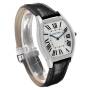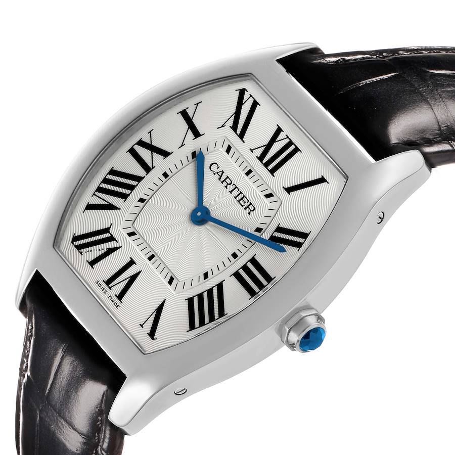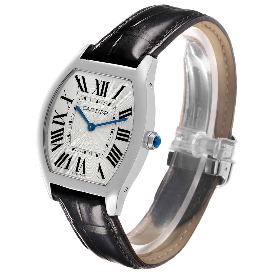 Replica Cartier Tortue White Gold Silver Dial Mens Watch WGTO0003 Card. Manual-winding movement. 18K white gold tonneau-shaped case 36.1 x 44.95 mm. Octagonal crown set with a faceted blue spinel. 18K white gold bezel. Scratch resistant domed sapphire crystal. Silver dial with painted black Roman numeral hour markers. Blue sword-shaped hands. Secret signature at VII. Black leather strap with an 18k white gold deployant clasp.