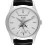 Dial: Silver dial with white gold index hour markers and dauphines hands. Annual calendar complication displaying the weekday & month at 12 o'clock. Date calendar at the 6 o'clock aperture. Subdial at the 6 o'clock position doubles as the moonphase & an AM/PM indicator.
