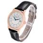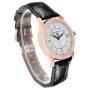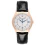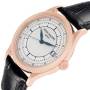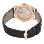 Bracelet: Black leather strap with an 18K rose gold tang buckle.