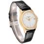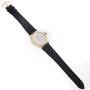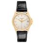 Bracelet: Black leather strap with 18K yellow gold tang buckle.