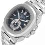 Replica Patek Philippe Nautilus Chronograph Steel Mens Watch 5980. Automatic self-winding chronograph movement. Stainless steel cushion-shaped case 40.5 mm in diameter. Transparent exhibition sapphire crystal caseback. Two pushers operate the chronograph function. Patek Philippe logo on the crown. Stainless steel bezel. Scratch resistant sapphire crystal. Blue-grey, horizontal embossed dial with luminescent white gold applied baton hour markers and hands. White sweeping seconds hand. Date calendar window at the 3 o'clock aperture. Subdial at 6 o'clock - displaying small seconds, 60 minutes, and 12 hour counters. Outer minute marker track. Stainless steel bracelet with hidden flip-lock clasp. Fits a 7 3/4" wrist.