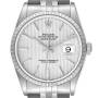 Replica Rolex Datejust Tapestry Dial Engine Turned Bezel Steel Mens Watch 16220. Officially certified chronometer automatic self-winding movement. Stainless steel oyster case 36.0 mm in diameter. Rolex logo on the crown. Stainless steel engine turned bezel. Scratch resistant sapphire crystal with a cyclops magnifier. Silver tapestry dial with raised silver-toned baton hour markers and luminescent hands. Date window at the 3 o'clock aperture. Stainless steel jubilee bracelet with fold over clasp. Fits a 7.5" wrist.