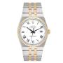 Replica Rolex Oysterquartz Datejust Steel Yellow Gold Buckley Dial Watch 17013. Quartz movement. Stainless steel and 18k yellow gold oyster case 36.0 mm in diameter. Rolex logo on the crown. 18k yellow gold fluted bezel. Scratch resistant sapphire crystal with a cyclops magnifier. White Buckley dial with luminescent black baton hands and Roman numeral hour markers. An outer minute track. Date window at the 3 o'clock aperture. Stainless steel and 18k yellow gold oysterquartz bracelet. Fits a 7" wrist.