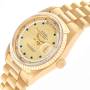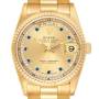 Dial: Champagne dial with original Rolex factory string diamonds and sapphire hour markers. Luminescent yellow gold baton hands. Weekday window at 12 o'clock. Date calendar at the 3 o'clock aperture.