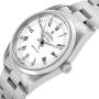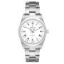 Rolex Air King White Dial Smooth Bezel Steel Mens Watch 14000. Automatic self-winding movement. Stainless steel oyster case 34.0 mm in diameter. Rolex logo on the crown. Stainless steel smooth bezel. Scratch resistant sapphire crystal. White dial with black Roman numeral hour markers and luminescent baton hands. Stainless steel oyster bracelet with a fold-over clasp. Fits a 7 1/4" wrist.