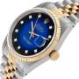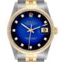 Rolex Datejust Vignette Diamond Steel Yellow Gold Mens Watch. Officially certified chronometer automatic self-winding movement. Stainless steel oyster case 36.0 mm in diameter. Rolex logo on the 18K yellow gold crown. 18k yellow gold fluted bezel. Scratch resistant sapphire crystal with a cyclops magnifier. Blue vignette dial with original Rolex factory diamond hour markers and yellow gold baton hands. Date calendar at the 3 o'clock aperture. Stainless steel and 18k yellow gold jubilee bracelet with a fold-over clasp. Fits a 7" wrist.