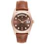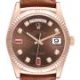Rolex President Day Date Rose Gold Diamond Ruby Dial Mens Watch 118135. Officially certified chronometer self-winding movement. 18k Everose rose gold oyster case 36.0 mm in diameter. Rolex logo on the crown. 18k Everose rose gold fluted bezel. Scratch resistant sapphire crystal with Cyclops magnifier. Chocolate dial with original Rolex factory diamond and rubies hour markers. Sweep center seconds. Outer minute and 1/2 seconds divisions, aperture for day at 12, aperture for date at 3. Brown leather strap with 18k Everose rose gold deployant buckle. Fits up to 7'' wrist.