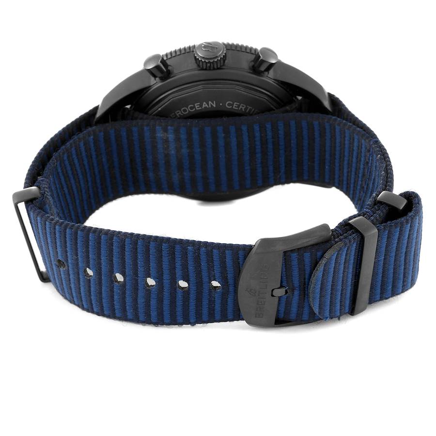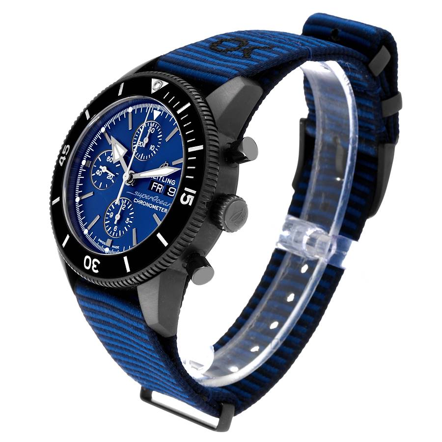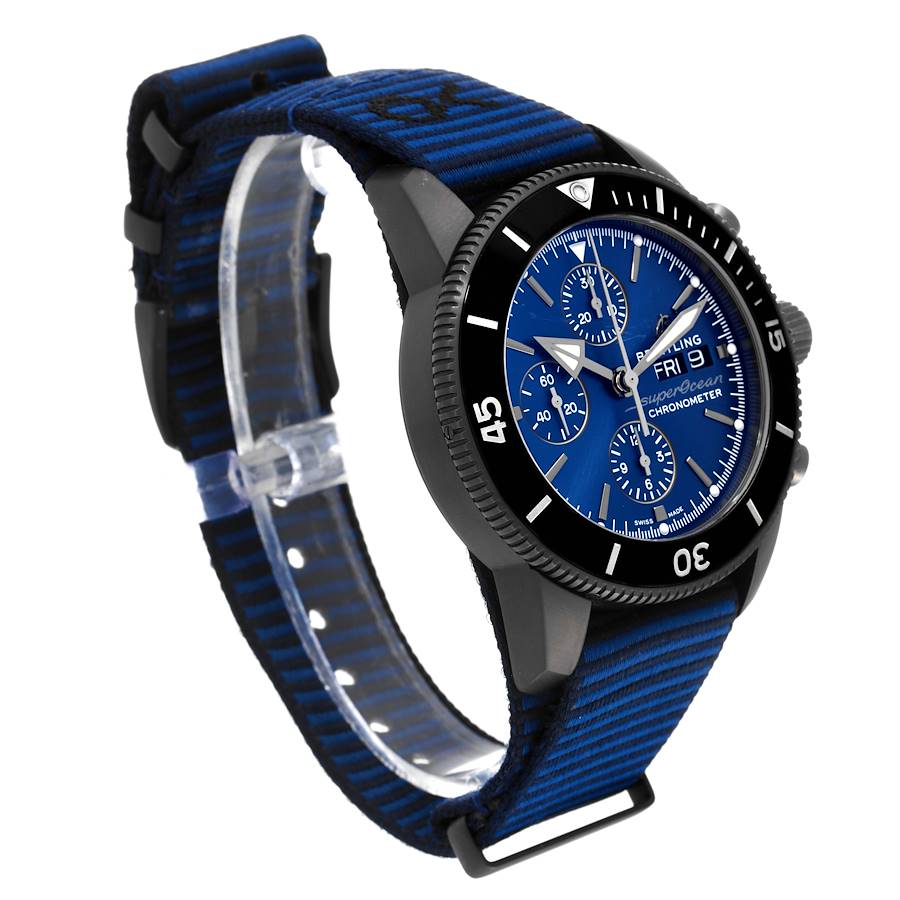 Replica Breitling SuperOcean Heritage DLC Steel Mens Watch M13313. Automatic self-winding movement. DLC-coated stainless steel case 44 mm in diameter and 15.6 mm in thickness. Screwed-down crown. Lapidated lugs. Black unidirectional rotating bezel. Scratch resistant sapphire crystal, glareproofed on both sides. Blue dial with raised steel baton indexes, luminous dots, and outer minute divisions. Three chronograph subdials - 12-hour, 30-minute, and 1/4th seconds. Polished luminous steel arrow hour and baton minute hands. Date and Day window at 3 o'clock. Blue canvas strap with DLC-coated stainless steel tang buckle.