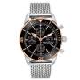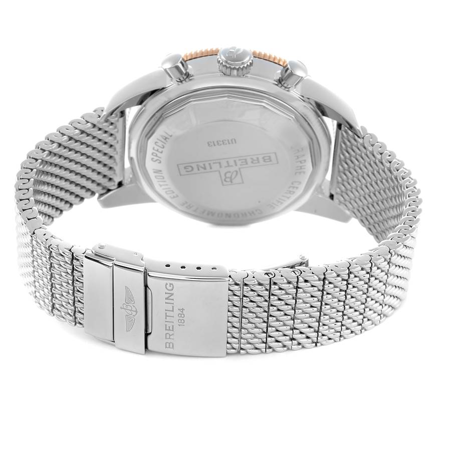 Replica Breitling Superocean Heritage II Steel Rose Gold Mens Watch U13313. Automatic self-winding chronometer movement with a chronograph function. Stainless steel round case 44.0 mm in diameter. Two pushers operate the chronograph functions. Breitling logo on the crown. 18K rose gold and black ceramic unidirectional rotating time-lapse bezel. Scratch resistant sapphire crystal. Black dial with luminescent rose gold Broad arrow and sword-shaped hands. Rose gold baton hour markers. Date calendar with day of the week window at the 3 o'clock aperture. Three chronograph rose gold-outlined subdials - running small seconds, 30-minutes, and 12-hour registers. Stainless steel mesh bracelet with a flip-lock clasp. Fits an 8 1/4'' wrist.