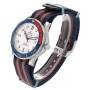 Bracelet: Red and blue fabric NATO strap with a stainless steel tang buckle.