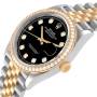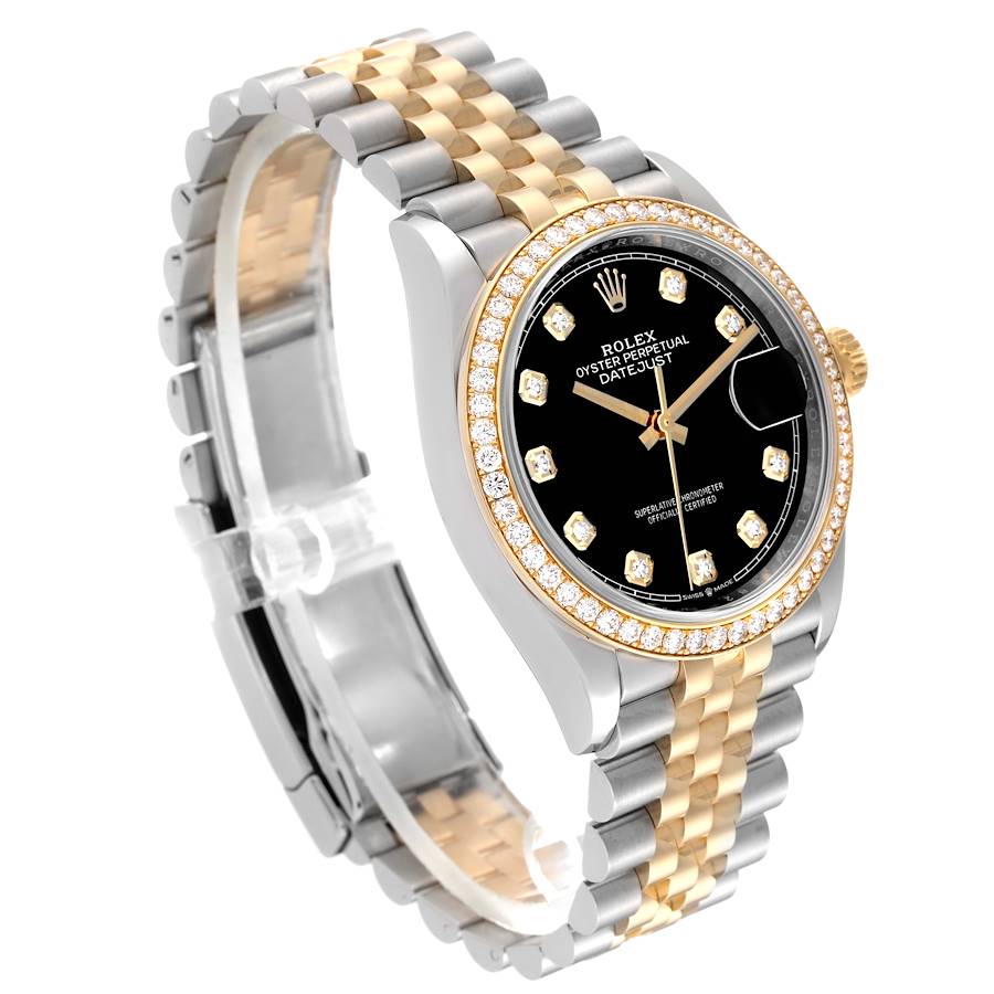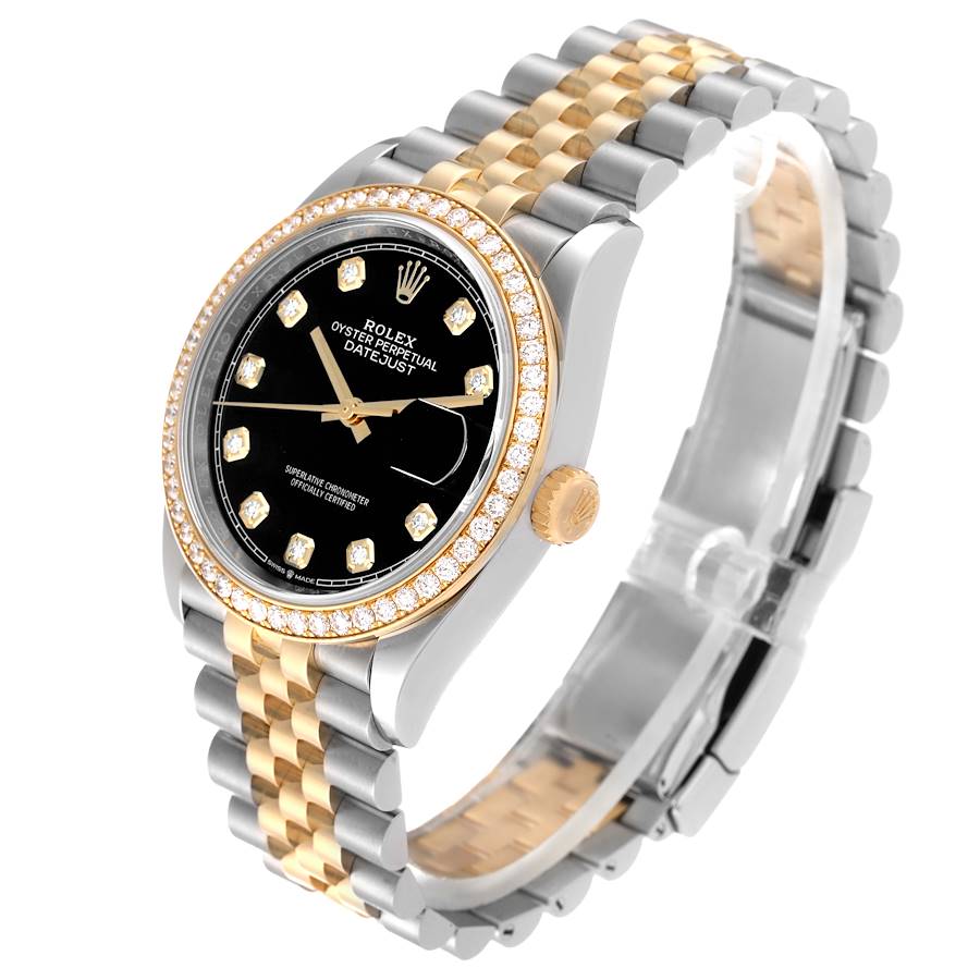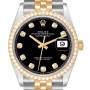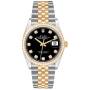 Replica Rolex Datejust 36 Steel Yellow Gold Diamond Dial Mens Watch 126283. Officially certified chronometer automatic self-winding movement. Stainless steel and 18K yellow gold oyster case 36.0 mm in diameter. Rolex logo on 18K yellow gold crown. 18k yellow gold original Rolex factory diamond bezel. Scratch resistant sapphire crystal with cyclops magnifier. Black dial with original Rolex factory diamond hour markers. Date calendar at 3 o'clock aperture. Stainless steel and 18k yellow gold jubilee bracelet with an oysterlock clasp. Fits 7.5" wrist.