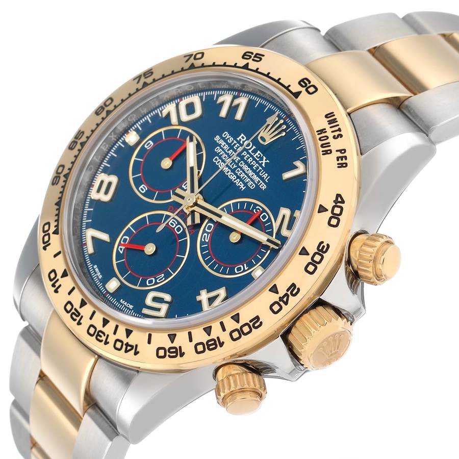 Replica Rolex Daytona Steel Yellow Gold Blue Dial Mens Watch 116503. Officially certified chronometer automatic self-winding movement. Stainless steel and 18k yellow gold oyster case 40.0 mm in diameter. Special yellow gold pushers that operate the chronograph function. Triplock winding crown protected by the crown guards. Rolex logo on the 18k yellow gold crown. 18k yellow gold bezel engraved with the tachymeter scale. Scratch resistant sapphire crystal. Blue dial with luminescent-inlayed yellow gold baton hands and Arabic numeral hour markers. Outer minute and 1/5th second track. Three chronograph subdials -- running small seconds, 30-minutes, and 12-hour registers. Stainless steel and 18k yellow gold oyster bracelet with a flip-lock clasp. Fits a 7.5" wrist.