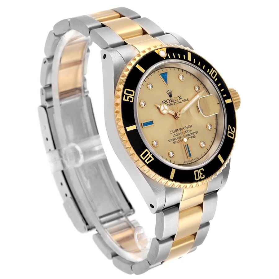 Replica Rolex Submariner Steel Yellow Gold Diamond Serti Mens Watch 16613. Officially certified chronometer, automatic self-winding movement. Stainless steel and 18k yellow gold oyster case 40.0 mm in diameter. Rolex logo on the 18k yellow gold crown. Pointed crown guards. Black insert special time-lapse unidirectional rotating yellow gold bezel. Scratch-resistant sapphire crystal with a cyclops magnifier. Champagne dial with original Rolex factory diamond and sapphire hour markers. Luminescent yellow gold Mercedes hands. Luminescent yellow gold lollipop-tipped sweeping seconds hand. Date calendar at the 3 o'clock aperture. Outer stick minute markers. Stainless steel and 18k yellow gold oyster bracelet with a flip-lock clasp. Fits a 7 1/2" wrist.